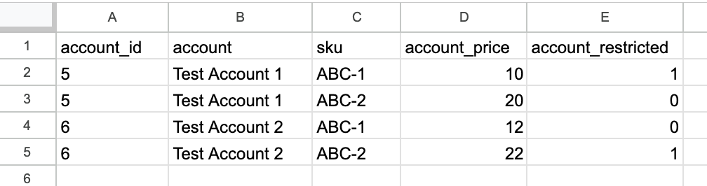 account_priceto 0 will set the price to $0.00. To remove a previous price from an account, leave the price blank. account_restrictedis 1 = allow, 0 = not allowed - our database only stores allowed, so setting 0 will do nothing unless the product was previously allowed, then it will remove it from the account.