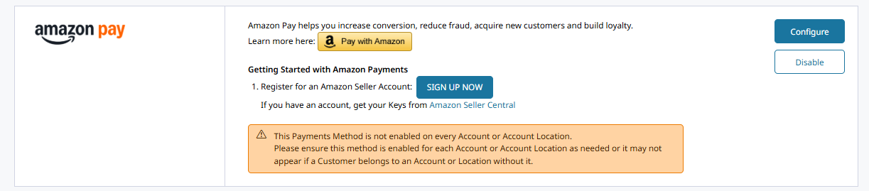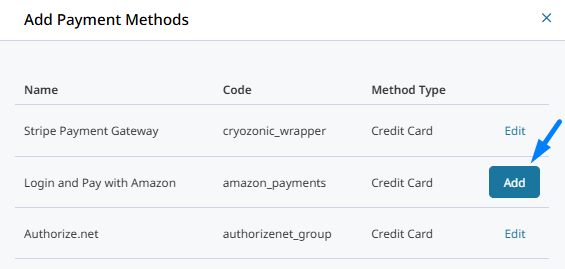 Click Add Payment Method from the either the top right corner of the page. Click Add next to "Login and Pay with Amazon" to enable the method.