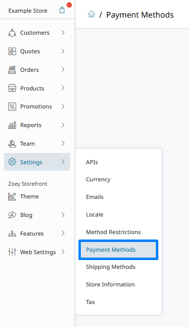 After logging in, hover over Settings and to click on Payment Methods