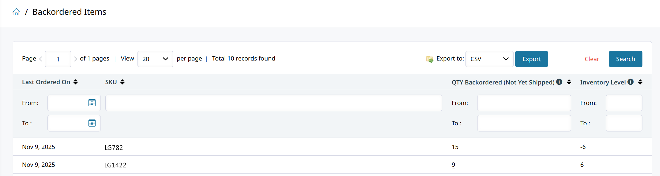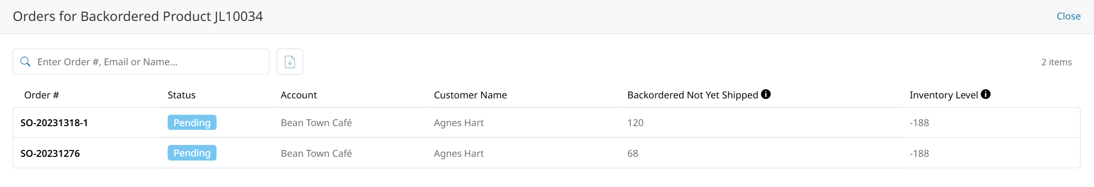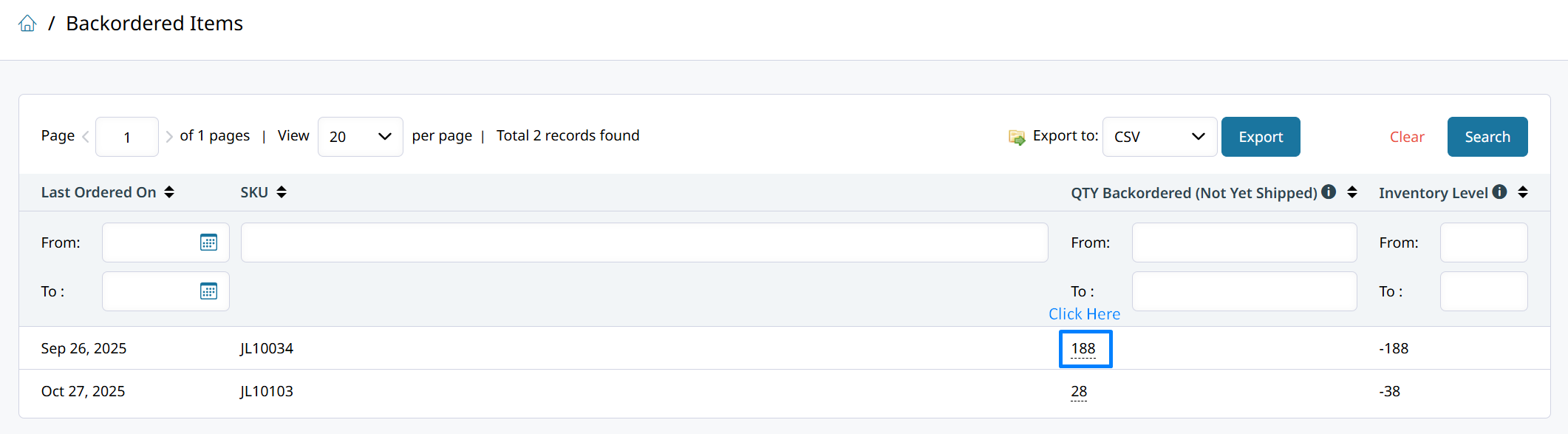 Click on any QTY Backordered number to view all orders containing that SKU on backorder.