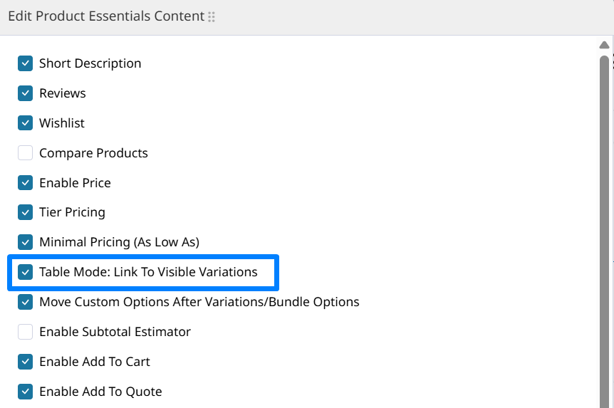 Individual products may have the Table Order Interface enabled within the "Variations" section of the Configurable Product Edit Screen (see below).