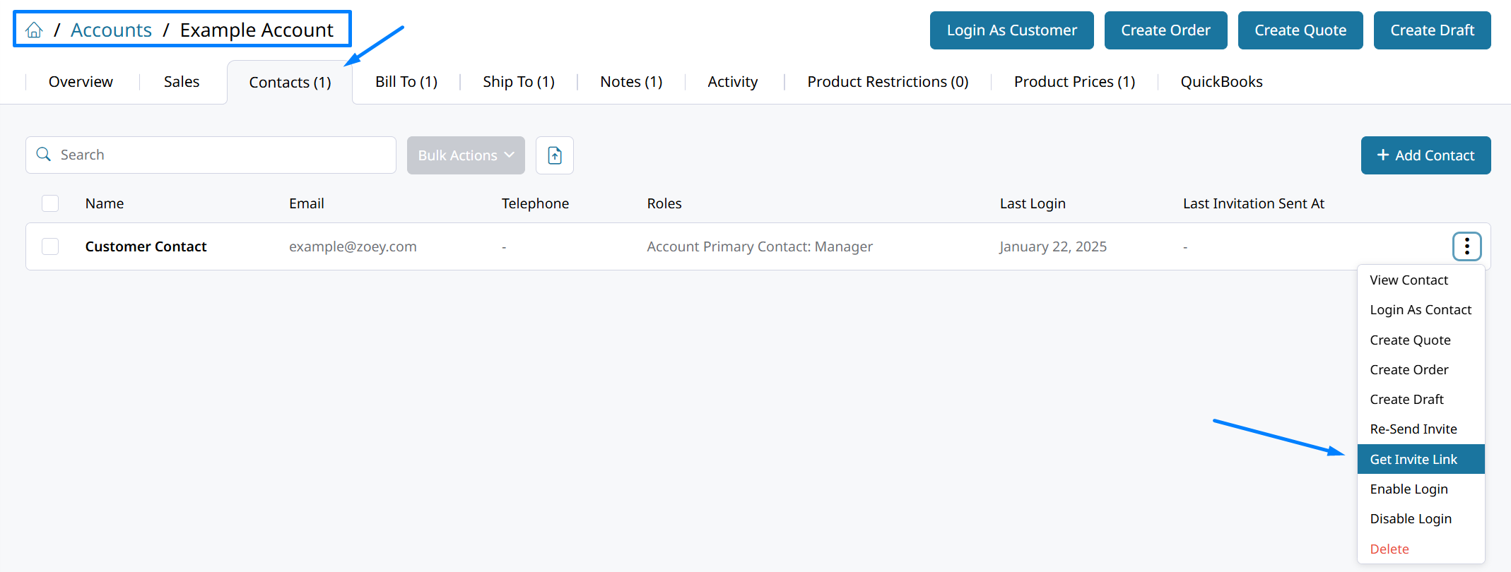 The invite link lets a new Contact set up their password. The link can be copied to your clipboard through the Account