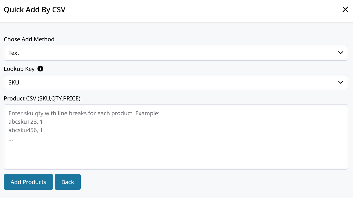Enter a SKU, the quantity, and an optional custom price delimited by comma.