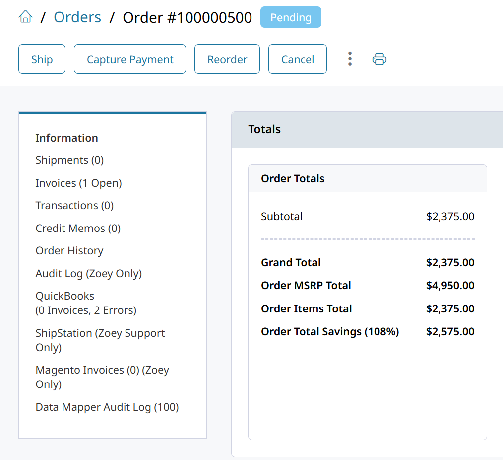- Order MSRP Total - Displays the sum of each item's MSRP. This is the total amount that the manufacturer would have the customer pay for all those items together.