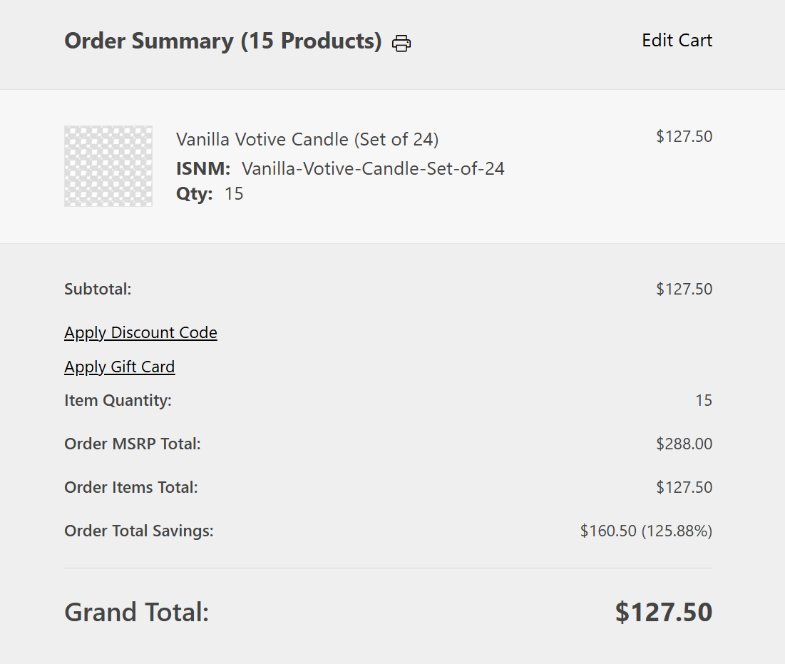 - Order Total Savings - Displays the dollar amount that the customer saved by shopping at your store. This displays as a percentage and as the dollar difference between MSRP Total and the Items Total.