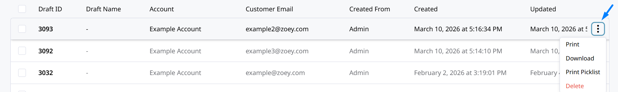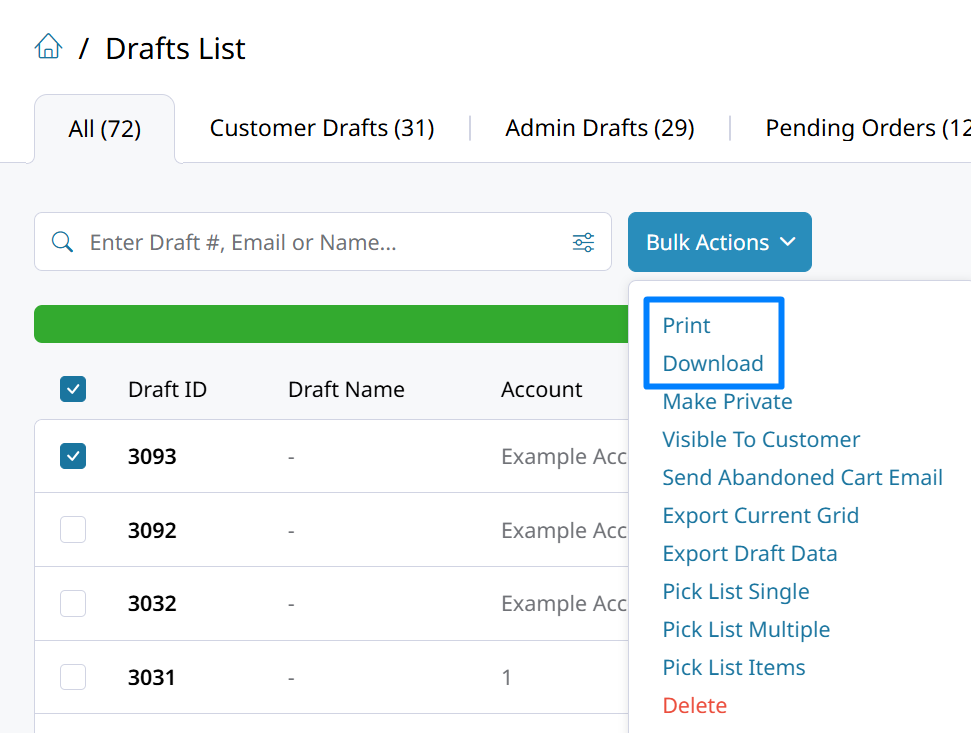 You can also print one draft at a time by clicking on the three-dots icon to the right of the draft and selecting Print. There is also an option here to Print Picklist.
