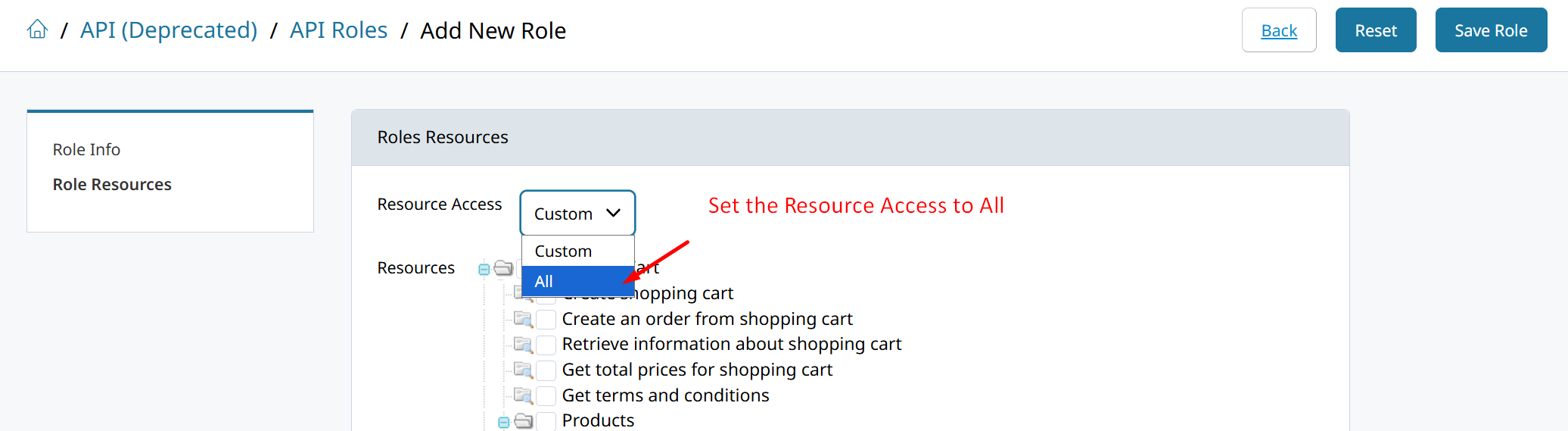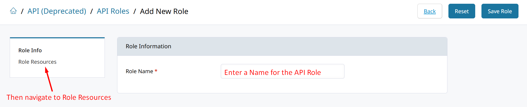Click on Add New Role, then enter a “Role Name” and click “Role Resources”.