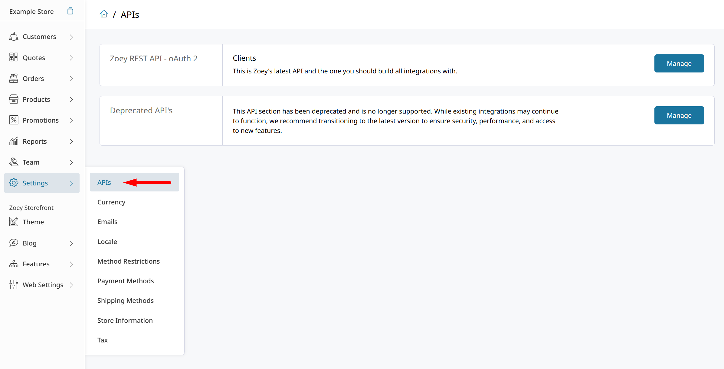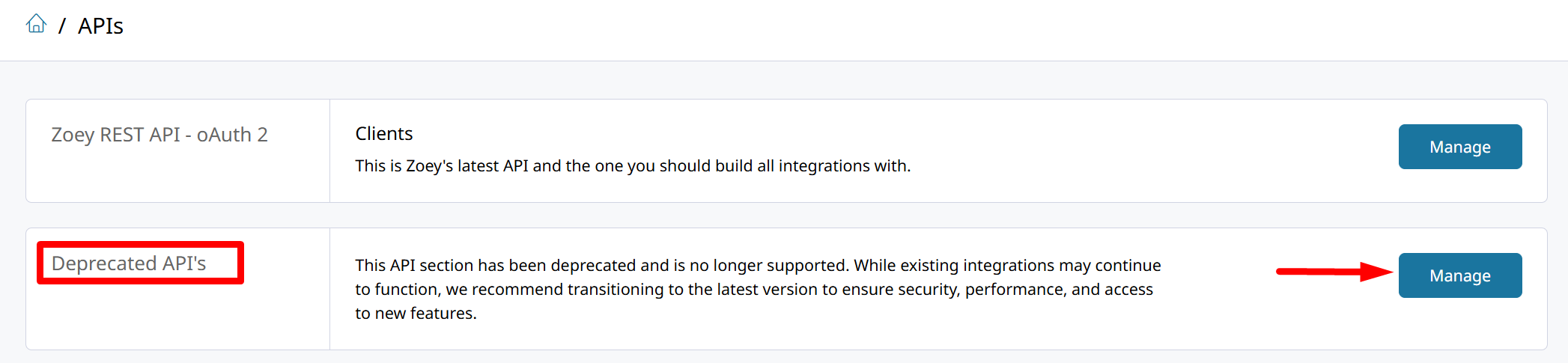Click Manage on the Deprecated API's