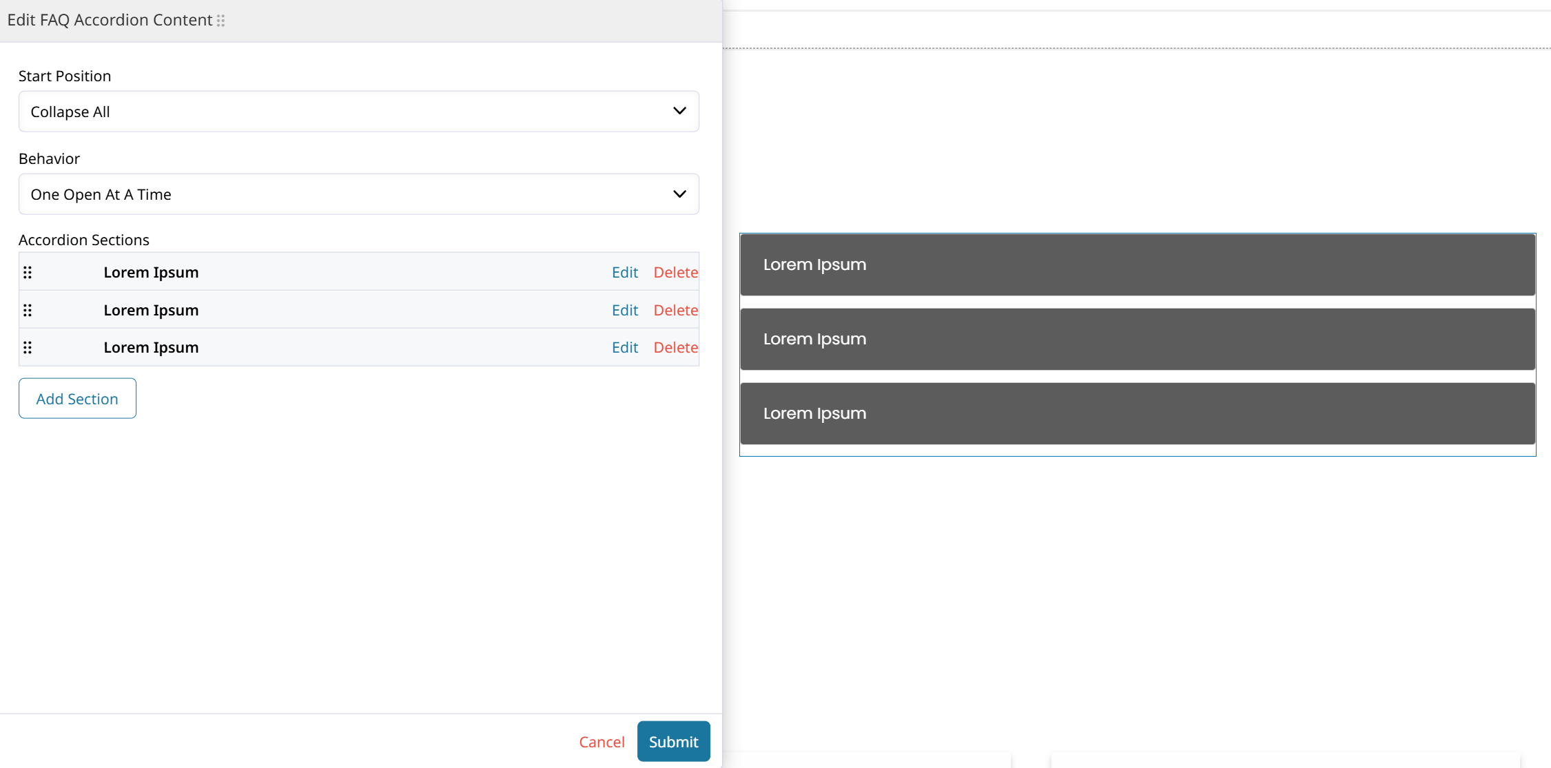 Each accordion section can be edited individually through the WYSIWYG text box and other fields. Enabling you to provide many different types of content through the expandable sections.
