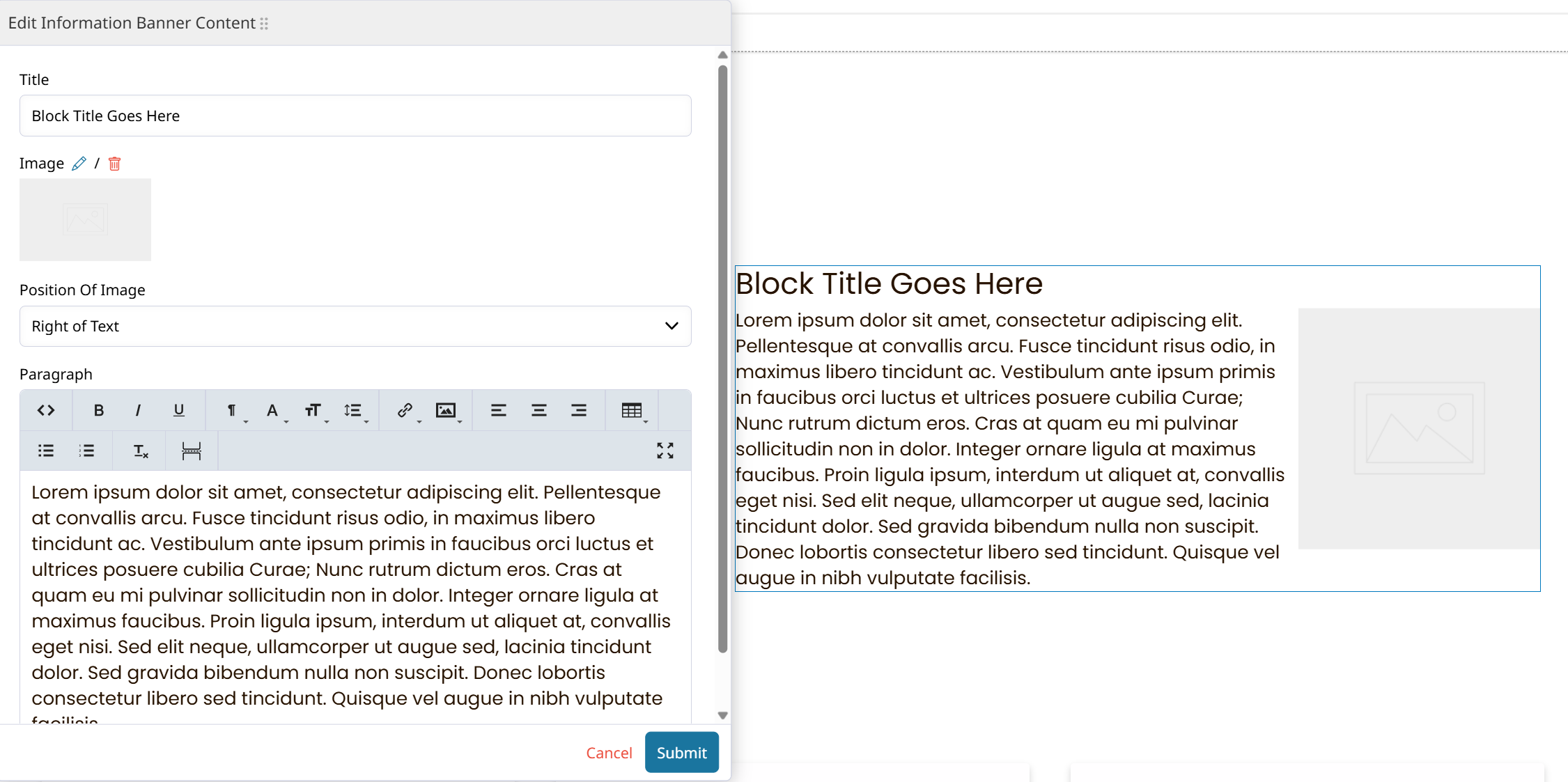 The first info banner displays a single block of text, title, and image horizontally.