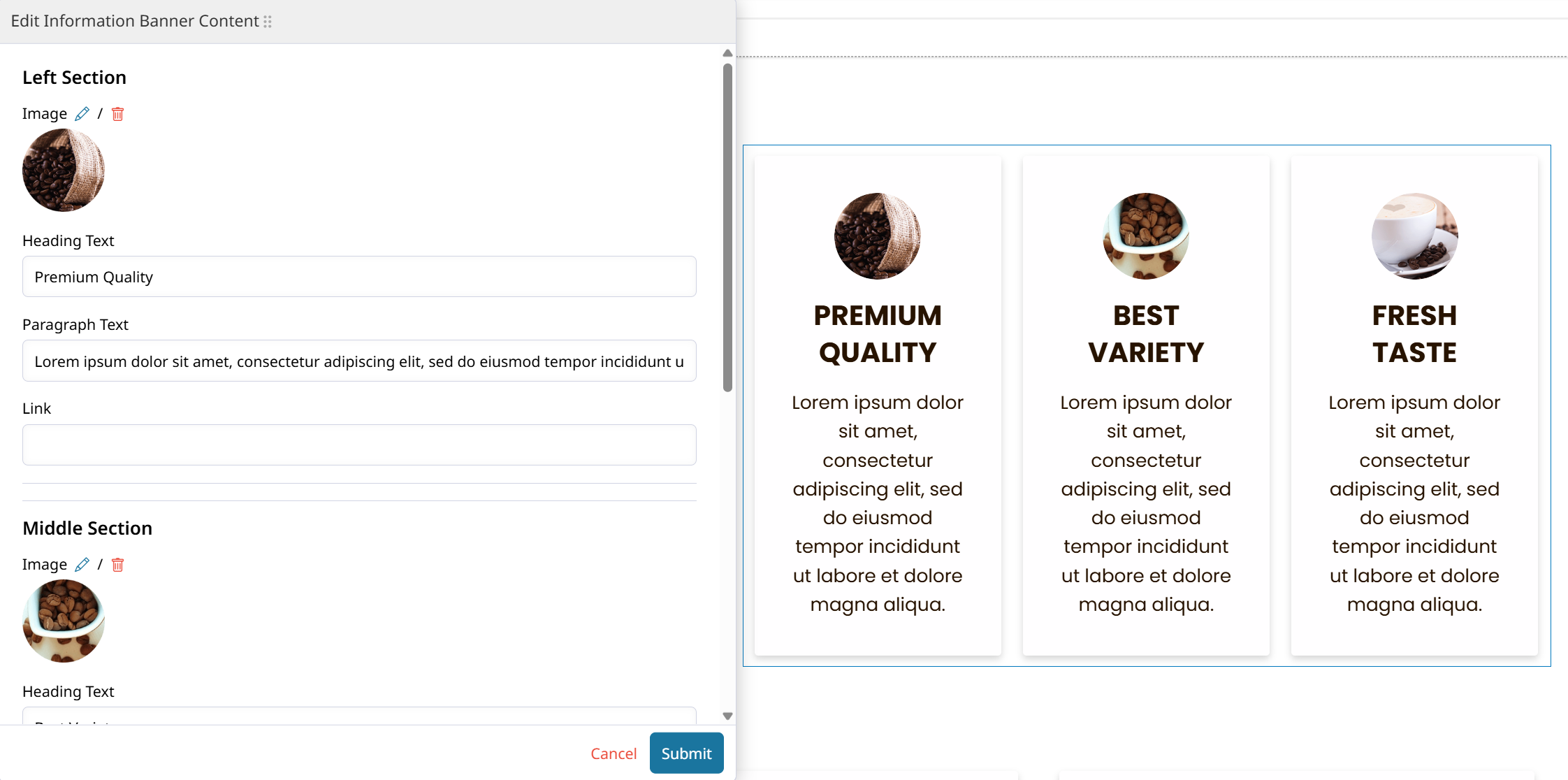 Information Banners are feature rich components that can display sections of information, images, and links within a banner.