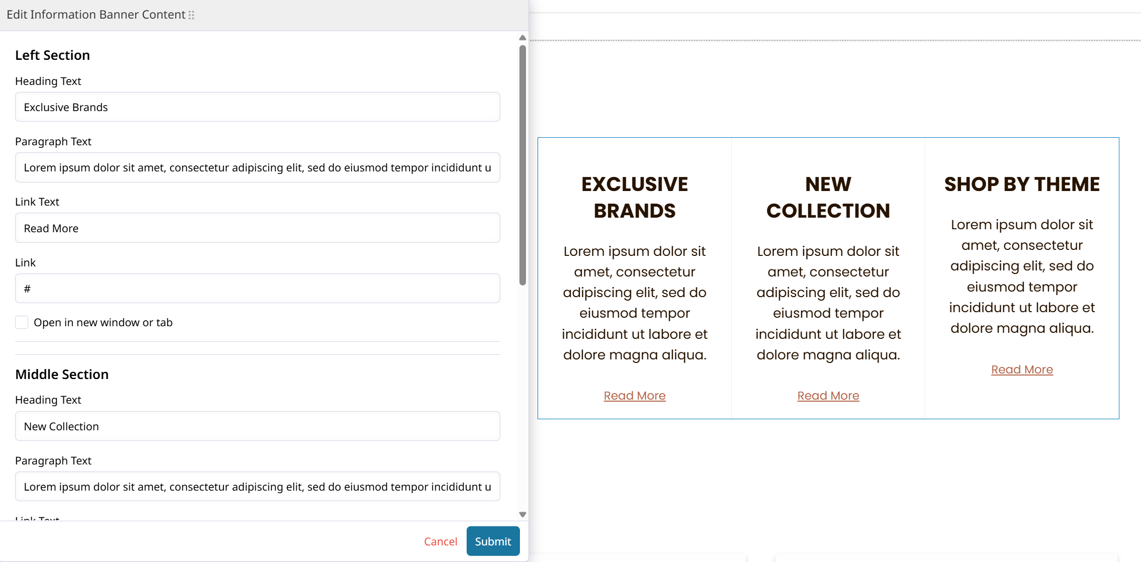This Information Banner does not have a place to display images, but is a great option for adding 3 columns of information and links.