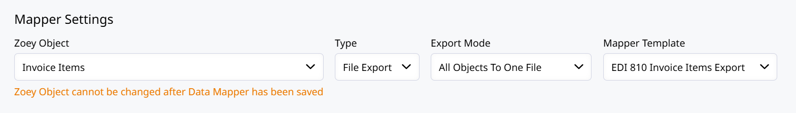 This mapper template will automatically set default Field Mappings to export Zoey Invoice Item data in the EDI 810 Flat File (CSV) format.