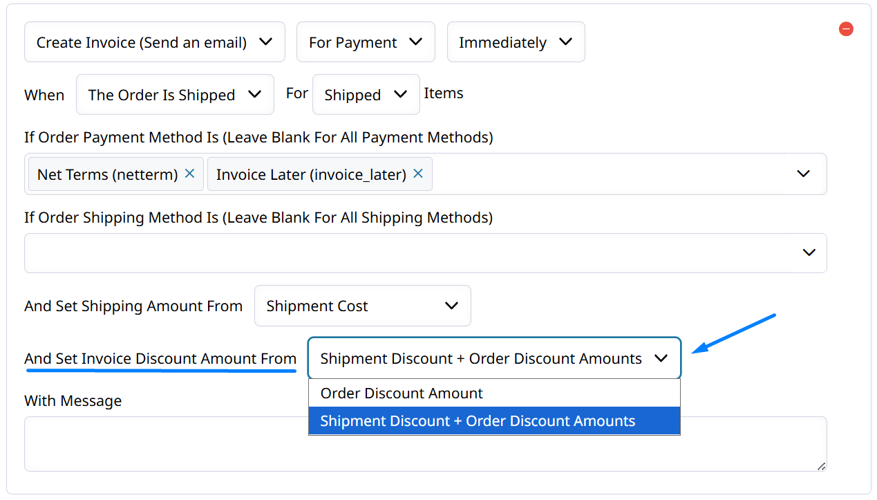 - Shipment Discount + Order Discount Amounts - The "Shipment Discount" will be combined with any Discounts on the Order and then set on the Invoice.