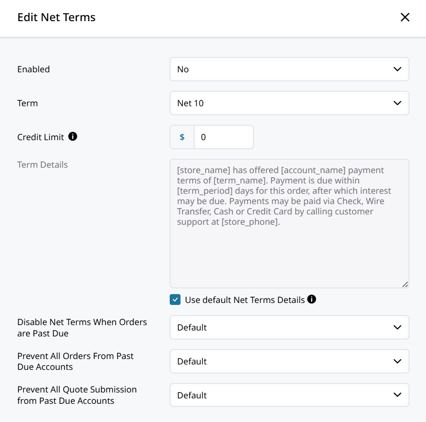 Then in the Edit Net Terms tab, specify the Term, Credit Limit and Term Details. You may also disable Net Terms when orders are past due.
