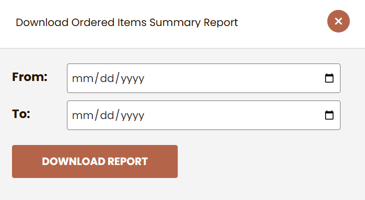 By clicking Download Summary Report a date range can be set to filter the items on the summary report. The report will download as a PDF.