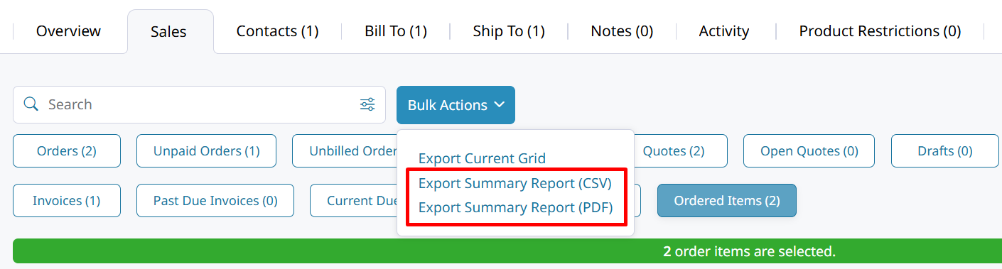 - Export Summary Report will download a CSV file that contains each product just once and the quantity of that product ordered by the Account.