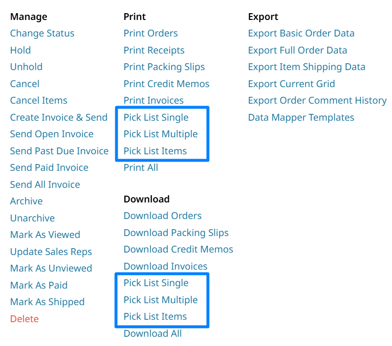 From your Orders screen, you can select one or multiple orders, then open Bulk Actions to Download or Print a Pick List.