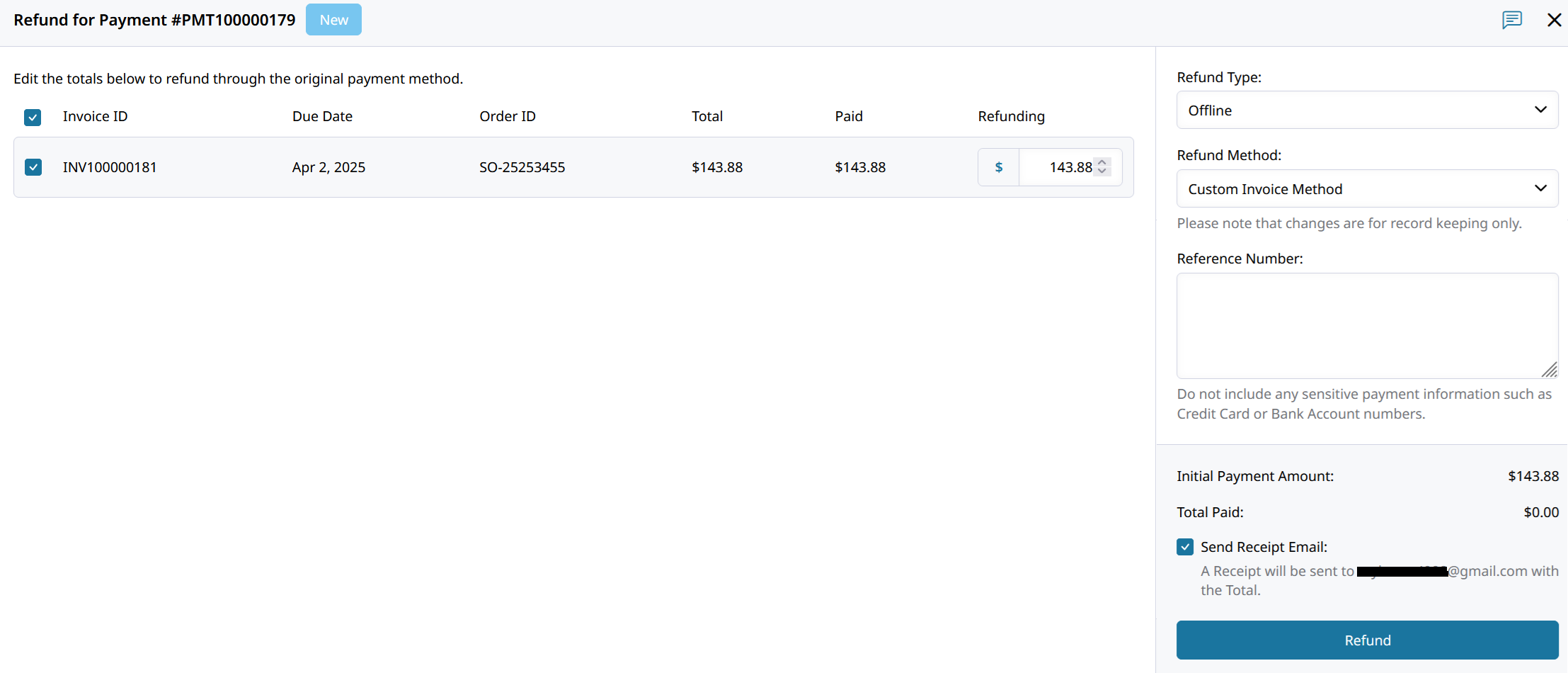 If you're giving your customer a cash refund, or correcting an accounting error, choose the Refund Method set the Refund Type to Offline.