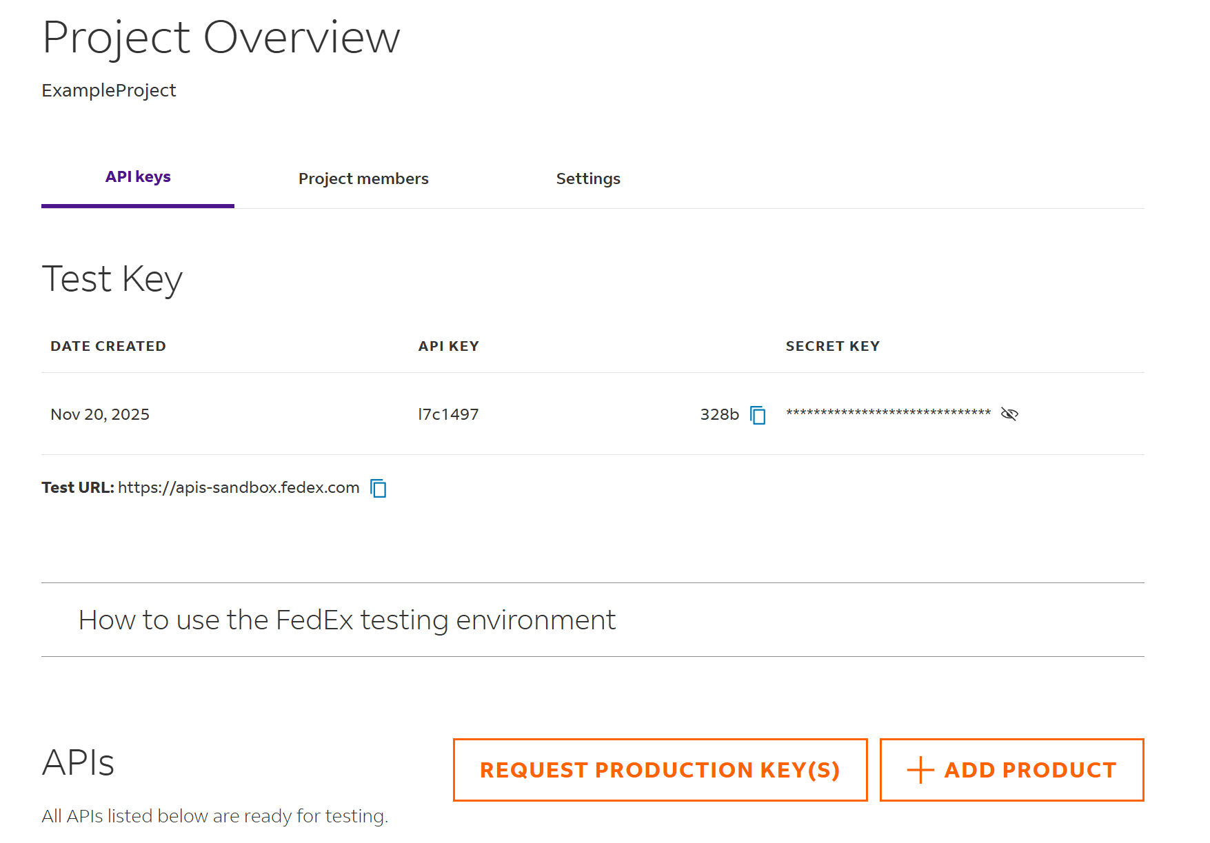 Copy the API KEY and the SECRET KEY. These are test keys to be used in to connect with the FedEx Sandbox